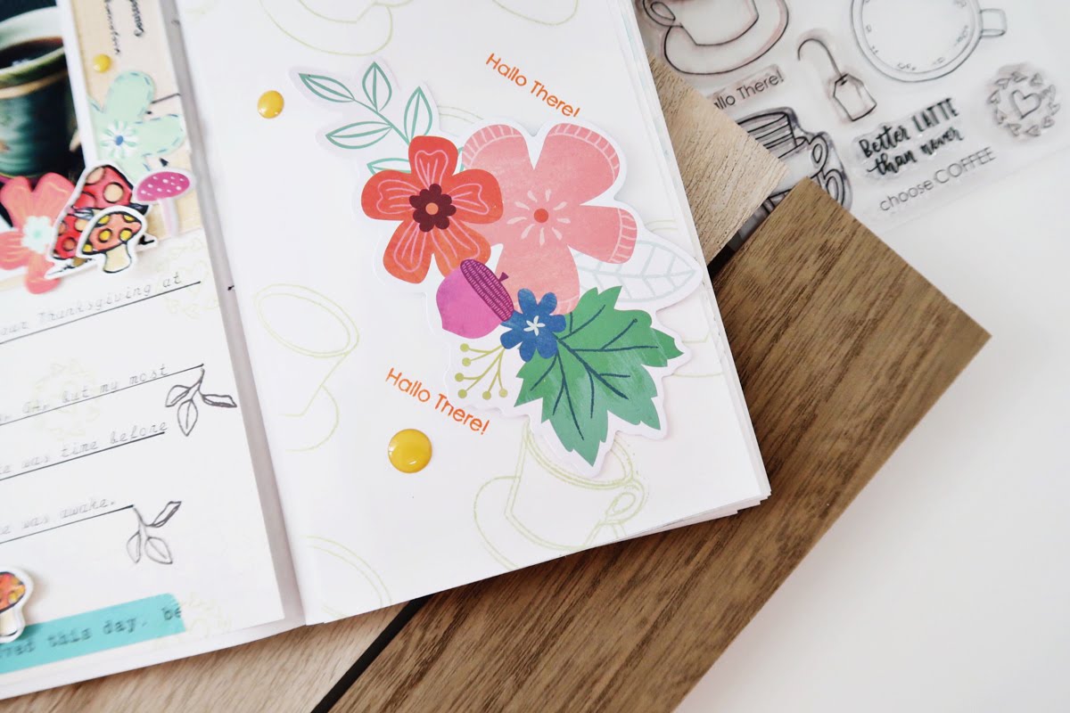 I stamped and colored a good bit before creating this project. The little toadstools I stamped and watercolored from the All Hallow’s Cuteness were the perfect touch to this woodsy, whimsical memory. To add a little more texture, I used a light green ink to stamp the circle heart image from the Coffee Art stamp set. I finished that page with washi tape, die cuts and puffy stickers.