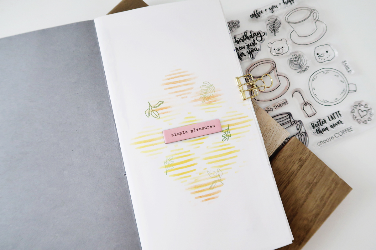 The Coffee Art stamp set really had me inspired to create this Traveler’s Notebook to document small happy moments. I started by measuring, trimming and then stamping some of the images using black ink onto grey cardstock. For the inside pages I used a Strathmore Sketch Paper Pad. The reason for this paper, is I wanted the pages to be thin. I can then either create on top of the pages, or my favorite is to work off the page, and then adhere my creation on top. Will share more of that in a bit. I also have a video showing how the inside pages came together, you can find at the end of this post.