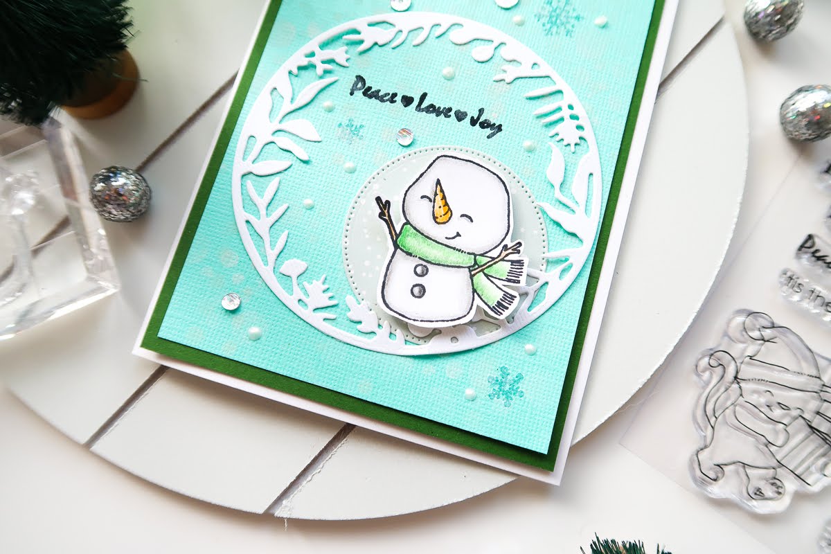 Pulling from the green scarf on this adorable snowy fellow, I used a dark green and an aqua green cardstock for my card panels.  To help my snowy friend stand out a little more, I layered him on top of a die cut pattern paper circle in a pale green with white dots.