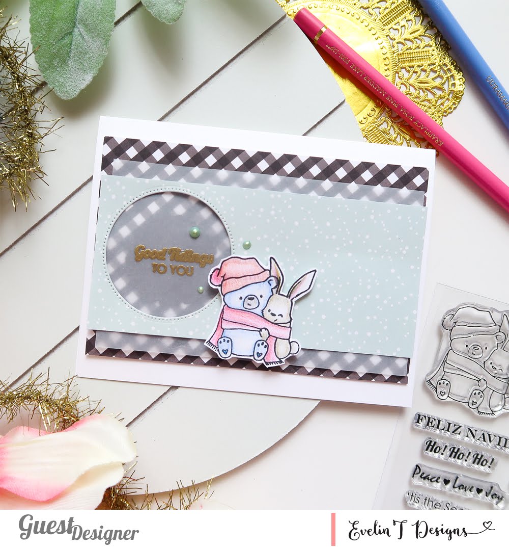 Hello Everyone!  Thankful to be back again here on the Evelin T Designs blog sharing two cards using the Good Tidings To You stamp set.  Both of these cards use the same pattern paper in two different ways, and both of the images were colored with pencils before I had my cards in mind.